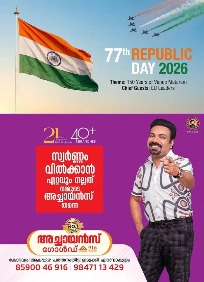 രാജ്യം ഇന്ന് എഴുപത്തി ഏഴാമത് റിപ്പബ്ലിക് ദിനം ആഘോഷിക്കുകയാണ്. ഭരണഘടന നിലവിൽ വന്നതിന്റെ വാർഷികമാണ് രാജ്യം റിപ്പബ്ലിക് ദിനമായി ആചരിക്കുന്നത്. ഡൽഹി കർത്തവ്യ പഥിൽ നടക്കുന്ന റിപ്പബ്ലിക് ദിന പരേഡിന് പ്രസിഡന്റ് ദ്രൗപതി മുർമു നേതൃത്വം നൽകും. റിപ്പബ്ലിക് ദിന പരേഡിൽ വിശിഷ്ടാതിഥികളായി യൂറോപ്പ്യൻ യൂണിയൻ നേതാക്കൾ പങ്കെടുക്കും. ഒരു പരമാധികാര, ജനാധിപത്യ, മതേതര റിപ്പബ്ലിക്കിലേക്കുള്ള രാജ്യത്തിന്റെ പരിവർത്തനം അടയാളപ്പെടുത്തുന്ന ദിനമാണിന്ന്. നീതി, സ്വാതന്ത്ര്യം, സമത്വം, സാഹോദര്യം എന്നീ തത്വങ്ങൾ ഉൾക്കൊള്ളുന്ന ഇന്ത്യൻ ഭരണഘടനയുടെ ആഘോഷമാണ് റിപ്പബ്ലിക് ദിനം. ഡോ. ബിആർ അംബേദ്കറുടെ നേതൃത്വത്തിലുള്ള ഭരണഘടനാ അസംബ്ലിയാണ് ഇന്ത്യൻ ഭരണഘടന തയാറാക്കിയത്. ജനാധിപത്യം നിലനിർത്തുന്നതിലും ദേശീയ ലക്ഷ്യങ്ങൾ നേടിയെടുക്കുന്നതിലും സാമൂഹിക നീതിക്കും സമത്വത്തിനും വേണ്ടി നിരന്തരം പരിശ്രമിക്കേണ്ടതിന്റെ ഓർമപ്പെടുത്തലാണ് ഈ ദിനം .