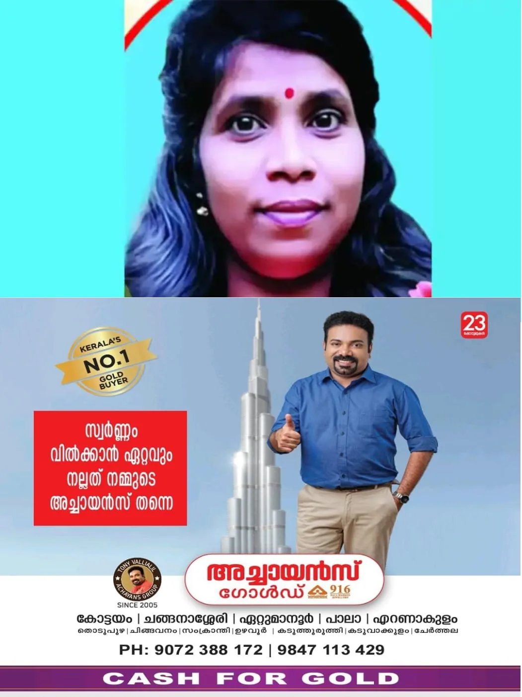 ഭർത്താവ്: മനു. മക്കള്: നിതീഷ് , നിഖിത , നിയുക്ത. സംസ്കാരം ഇന്നു ഉച്ചകഴിഞ്ഞ് രണ്ടരക്ക് വീട്ടുവളപ്പില്.