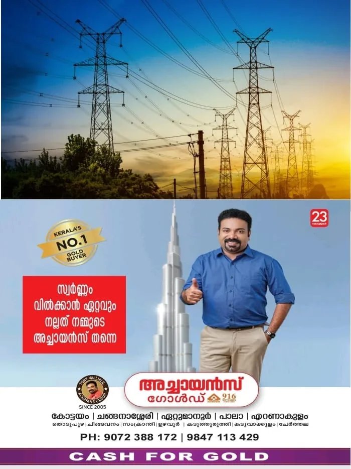 ഈരാറ്റുപേട്ട ഇലക്ട്രിക്കൽ സെക്ഷന്റെ പരിധിയിൽ HT ടച്ചിംഗ് ക്ലിയറൻസ് നടക്കുന്നതിനാൽ വാളകം, കോലാനിതോട്ടം ട്രാൻസ്ഫോർമറുകളുടെ പരിധിയിൽ രാവിലെ 8.30 മുതൽ 5 വരെ വൈദ്യുതി മുടങ്ങുന്നതാണ്.