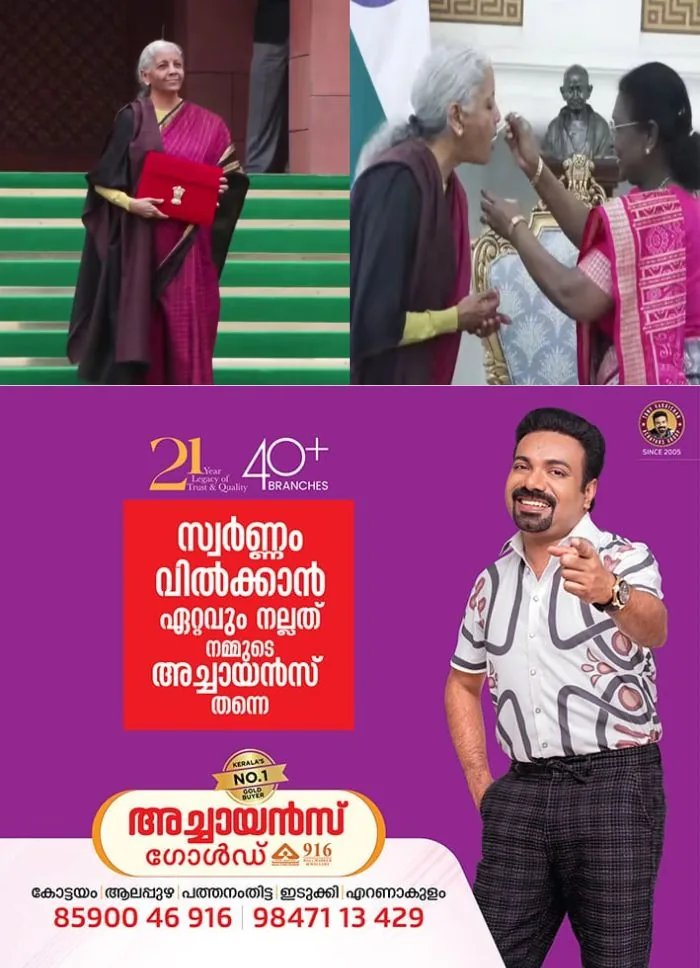 മൂന്നാം മോദി സർക്കാരിന്റെ മൂന്നാം ബജറ്റ് അവതരണമാണ് ഇന്ന് നടക്കാൻ പോകുന്നത്. ബജറ്റ് അവതരണത്തിന് മുന്നോടിയായി ധനമന്ത്രി നിർമല സീതാരാമൻ രാഷ്ട്രപതി ദ്രൗപദി മുർമുവിനെ സന്ദർശിച്ചു. രാഷ്ട്രപതിയിൽ നിന്നും ബജറ്റ് അവതരണത്തിന് അനുമതി തേടി. കൂടാതെ നിർമല സീതാരാമന് രാഷ്ട്രപതി മധുരം നൽകുകയും ചെയ്തു. രാവിലെ ഔദ്യോഗിക വസതിയിൽ നിന്നും ധനകാര്യ മന്ത്രാലയത്തിലെത്തിയ ശേഷമാണ് നിർമല സീതാരാമൻ രാഷ്ട്രപതി ഭവനിലെത്തിയത്. കാഞ്ചീപുരം സാരി ധരിച്ചാണ് ബജറ്റ് അവതരണത്തിന് എത്തിയത്. പർപ്പിൾ കളറിൽ സ്വർണ നിറത്തിലുള്ള കള്ളികളും കോഫി ബ്രൗൺ കസവുമുള്ള സാരിയുമാണ് ധരിച്ചിരിക്കുന്നത്. തമിഴ്നാട് സ്വദേശിയായ നിര്‍മല നേരത്തെ എട്ടു ബജറ്റും വിവിധ ഇന്ത്യൻ കൈത്തറി സാരികളുടുത്താണ് അവതരിപ്പിച്ചത്.