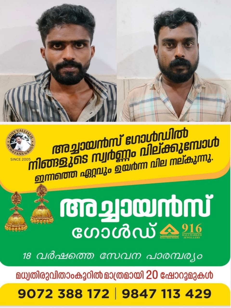 ഭരണങ്ങാനം ഉള്ള നാട് ഭാഗത്ത് കൂടമറ്റത്തിൽ വീട്ടിൽ ബിനീഷ് (27), ഭരണങ്ങാനം ഉള്ള നാട് ഭാഗത്ത് ചെമ്പൻപുരയിടത്തിൽ വീട്ടിൽ അനൂപ് (35) എന്നിവരെയാണ് പാലാ പോലീസ് അറസ്റ്റ് ചെയ്തത്.