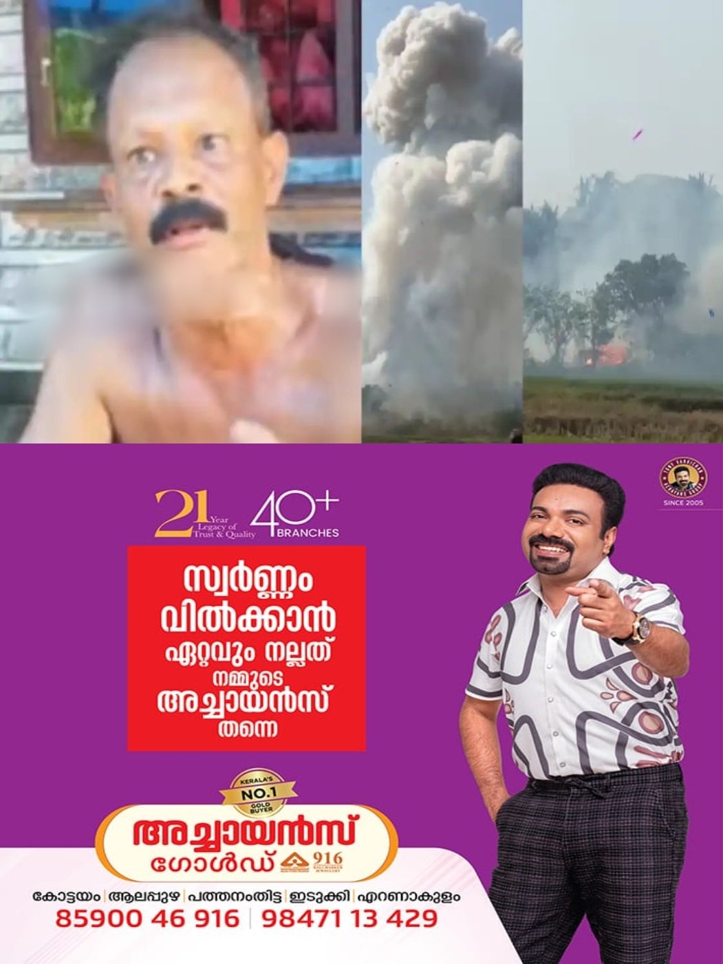 പെട്ടന്ന് തിരിഞ്ഞ് നോക്കിയപ്പോള് ശബ്ദത്തോടെ കത്താൻ തുടങ്ങിയിരുന്നു. അത് കണ്ട ഉടൻ തന്നെ വീണ് മറിഞ്ഞ് എഴുന്നേറ്റ് ഓടുകയായിരുന്നു. പിന്നാലെ മുഴുവൻ പൊട്ടാൻ തുടങ്ങി. പിന്നെ അവിടെ നിന്നില്ല. രണ്ട് മൂന്ന് സെക്കന്റുകള് കൊണ്ടാണ് എല്ലാം സംഭവിച്ചത്. വേലിക്കമ്പി എടുത്ത് ചാടിയാണ് പാടത്തേക്ക് എത്തിയത്. എന്തോ ഭാഗ്യത്തിനാണ് രക്ഷപ്പെട്ടത്.