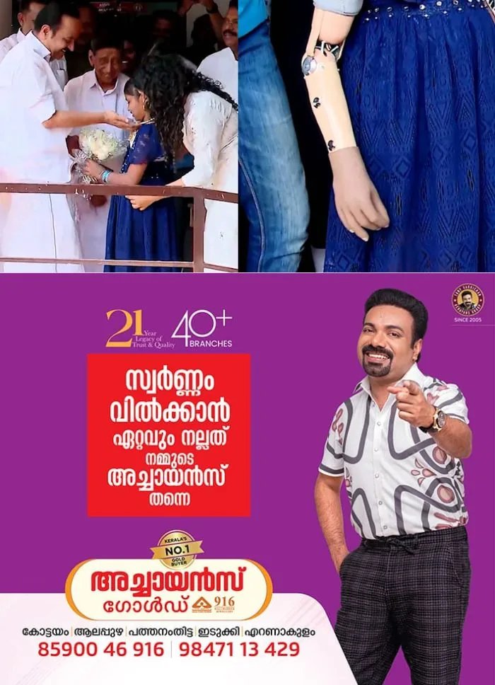 പാലക്കാട് ജില്ലാ ആശുപത്രിയിലുണ്ടായ ചികിത്സാപ്പിഴവ് മൂലം കൈ മുറിച്ചുമാറ്റേണ്ടിവന്ന പല്ലശ്ശന സ്വദേശിയായ ഒന്പതുവയസുകാരിക്ക് കൃതിമ കൈ ഘടിപ്പിച്ചു. പിന്നാലെ വിനോദിനിയെ പ്രതിപക്ഷ നേതാവ് വിഡി സതീശന് സന്ദർശിച്ചു. പുതിയ കൃത്രിമ കൈ കൊണ്ട് വിഡി സതീശന് പൂച്ചെണ്ട് നല്കിയാണ് വിനോദിനി സ്വീകരിച്ചത്. കൊച്ചിയിലെ സ്വകാര്യ ക്ലിനിക്കില് വെച്ചാണ് വിനോദിനിയ്ക്ക് കൃത്രിമ കൈ ഘടിപ്പിച്ചത്. കുട്ടിയുടെ ചികിത്സയ്ക്കും കൃത്രിമ കൈ വയ്ക്കുന്നതിനും ആവശ്യമായ മുഴുവൻ തുകയും പ്രതിപക്ഷ നേതാവാണ് അടച്ചത്. പാലക്കാട് ജില്ലാ ആശുപത്രിയിൽ ഉണ്ടായ ചികിത്സാപ്പിഴവ് മൂലമാണ് വിനോദിനിയുടെ വലതുകൈ മുറിച്ചുമാറ്റേണ്ടി വന്നത്.