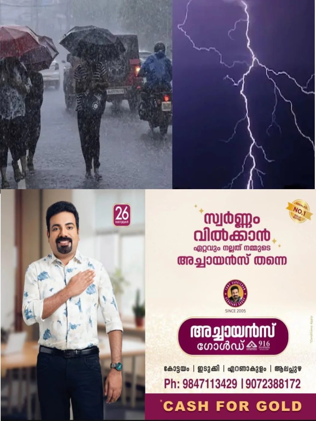തിരുവനന്തപുരം, കൊല്ലം, പത്തനംതിട്ട, ആലപ്പുഴ, കോട്ടയം, ഇടുക്കി, എറണാകുളം, തൃശ്ശൂർ, മലപ്പുറം, കോഴിക്കോട് കണ്ണൂർ ജില്ലകളില് ഒറ്റപ്പെട്ടയിടങ്ങളില് ഇടിമിന്നലോട് കൂടിയ ഇടത്തരം മഴയ്ക്കും മണിക്കൂറില് 60 കിലോമീറ്റർ വരെ വേഗതയില് ശക്തമായ കാറ്റിനും.